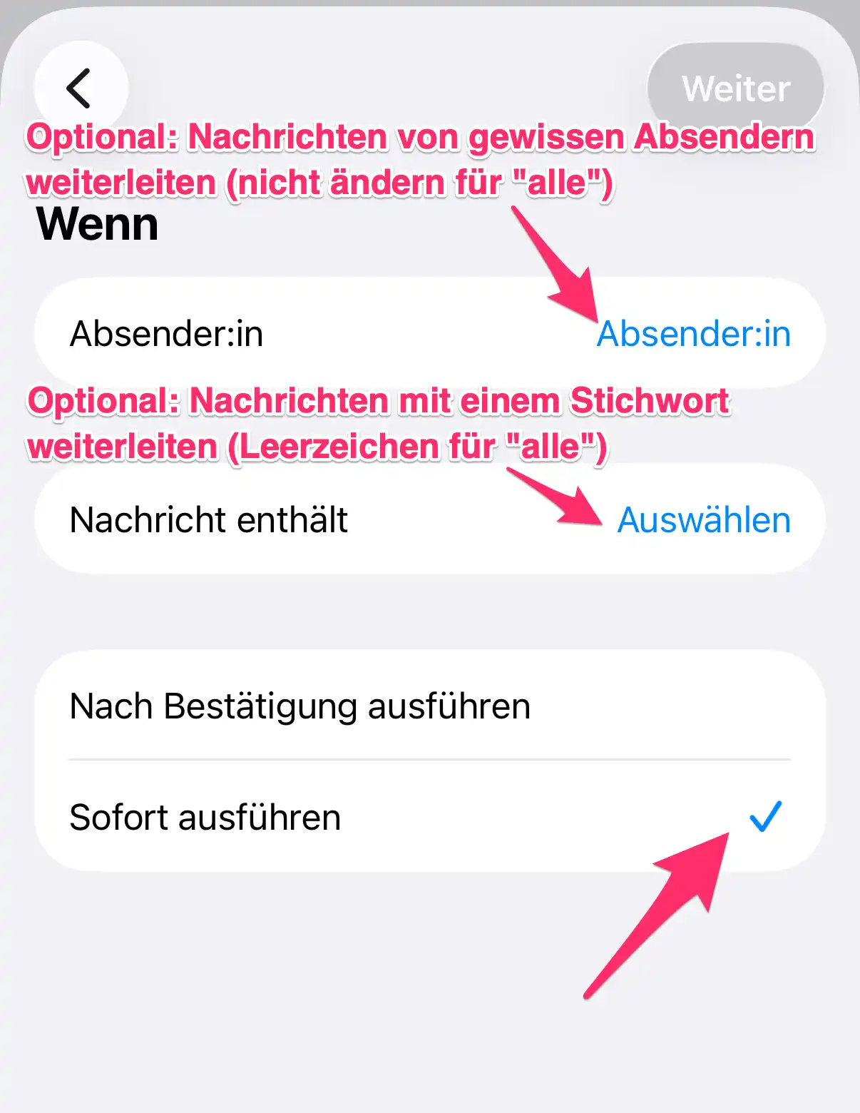 - Wählen Sie Optional einen Absender, dessen Nachrichten weitergeleitet werden