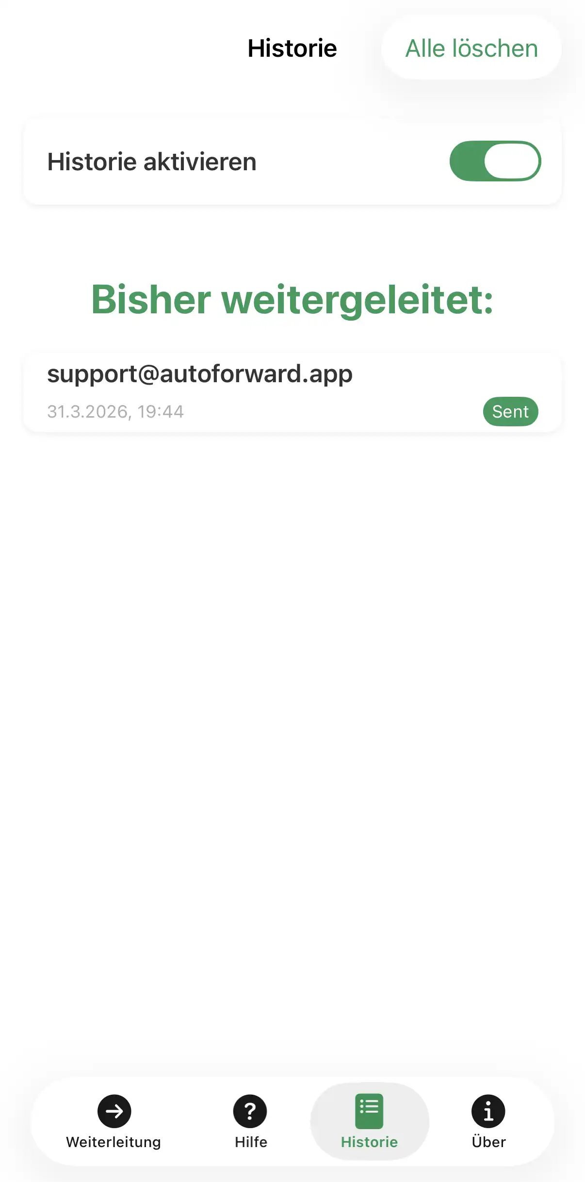 Sie können den Verlauf der weitergeleiteten Nachrichten in der autoforward App unter dem Tab "Historie" einsehen. Jeder Eintrag zeigt den Empfänger, den Zeitstempel und den Zustellstatus an.